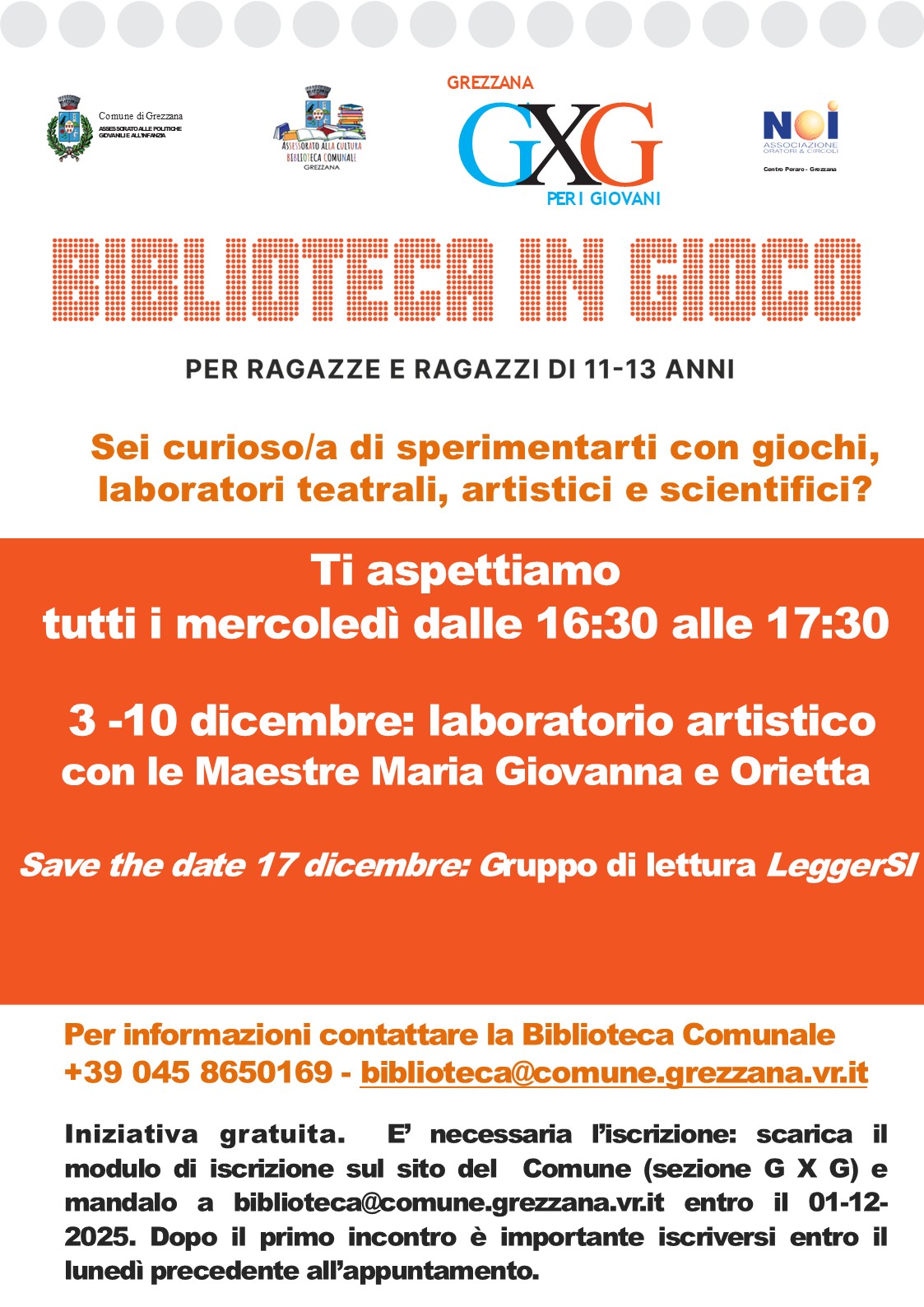 GxG – Grezzana per i Giovani” è un progetto che nasce dalla collaborazione tra gli Assessorati alle politiche giovanili e quello alla Cultura con le realtà del nostro territorio che si rivolgono ai giovani.Le collaborazioni con la Biblioteca Comunale, l’Istituto Comprensivo G. Pascoli e altre realtà del nostro territorio hanno permesso di creare diverse iniziative a favore dei nostri ragazzi, raggruppandole “sotto lo stesso tetto”, in modo da offrire a ciascuno di loro delle opportunità quanto più vicine ai propri desideri e attitudini. A dicembre proponiamo, con le Maestre Maria Giovanna e Orietta, due laboratori artistici per ragazzi e ragazze dagli 11 ai 13 anni.