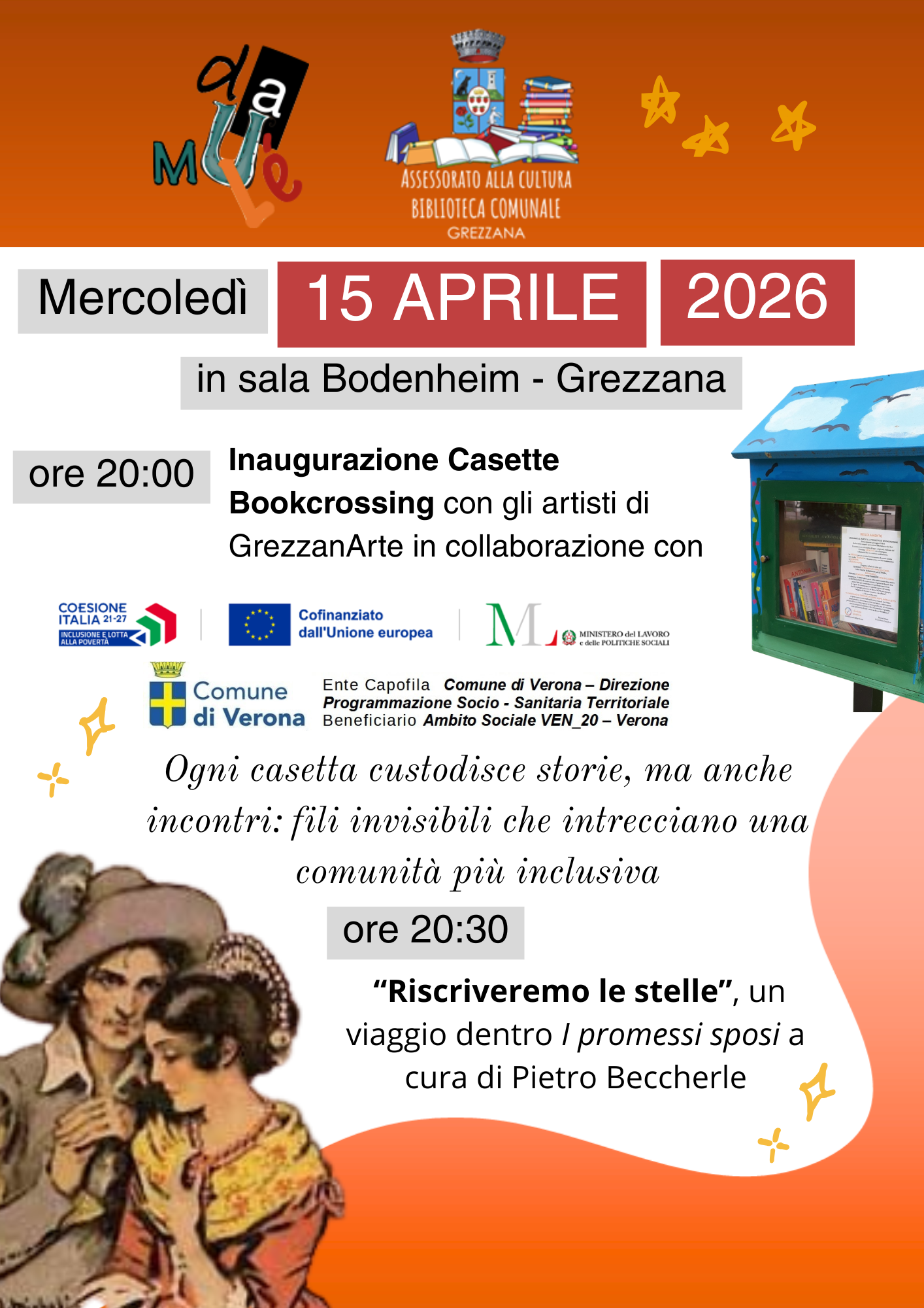 La serata si aprirà alle ore 20.00 con l’inaugurazione delle nuove casette di bookcrossing, realizzate in collaborazione con gli artisti di GrezzanArte. L’iniziativa nasce con l’obiettivo di incentivare la condivisione libera dei libri e la diffusione della lettura, trasformando gli spazi del territorio in luoghi di scambio, incontro e partecipazione. Ogni casetta diventa così un punto di connessione tra persone e storie, contribuendo a rafforzare il senso di comunità e inclusione.