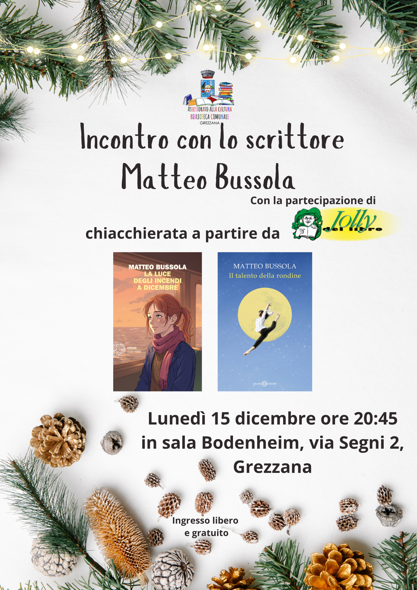 Incontro con autore Matteo Bussola intervistato da Claudio De Signori. Lo scrittore presenterà i suoi due ultimi capolavori: La luce degli incendi a dicembre e Il talento della rondine.